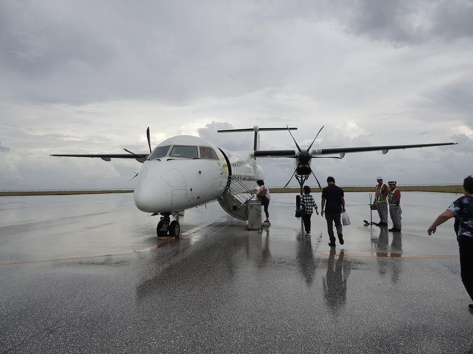 | 雨が小ぶりになったタイミングで搭乗する。 荷物を持って歩きながらの撮影なので写真が傾いている(苦笑)。 |