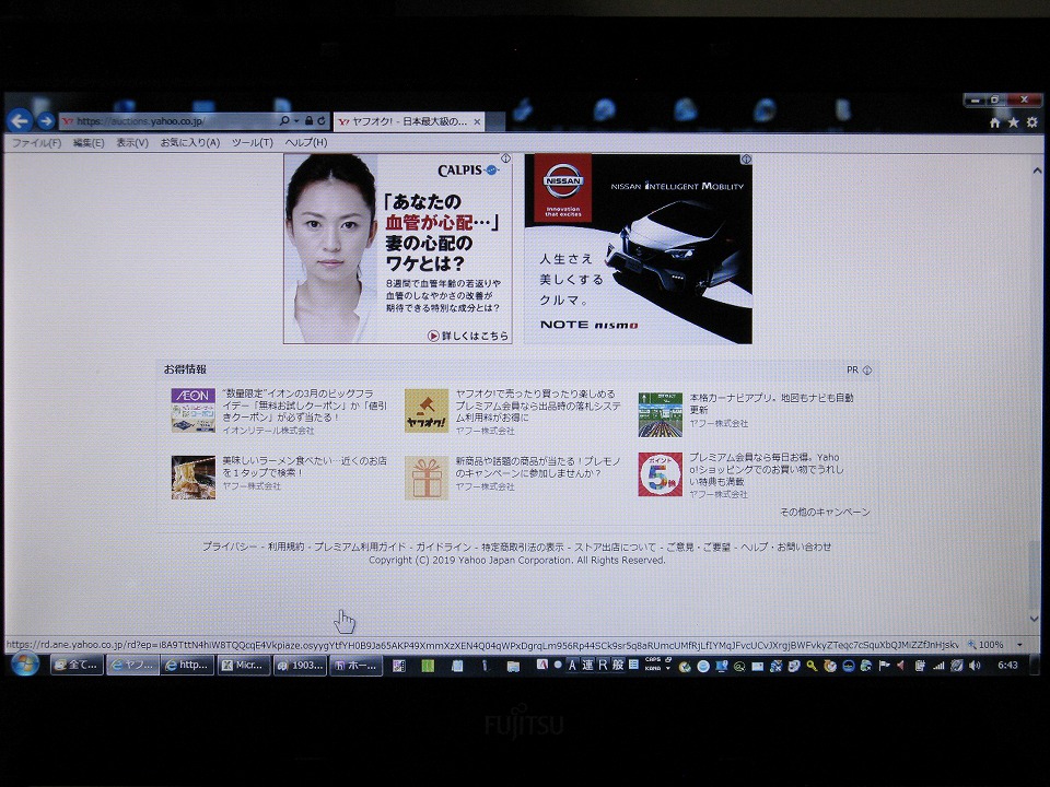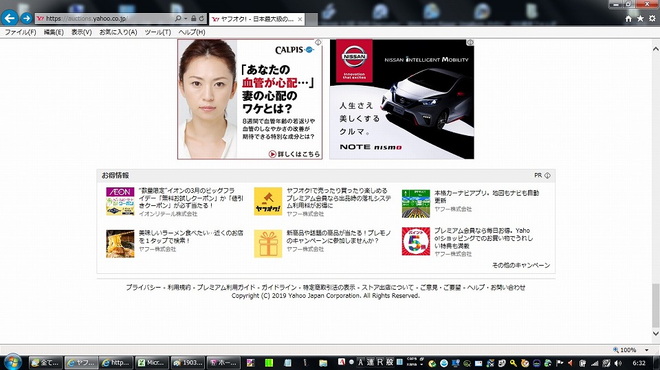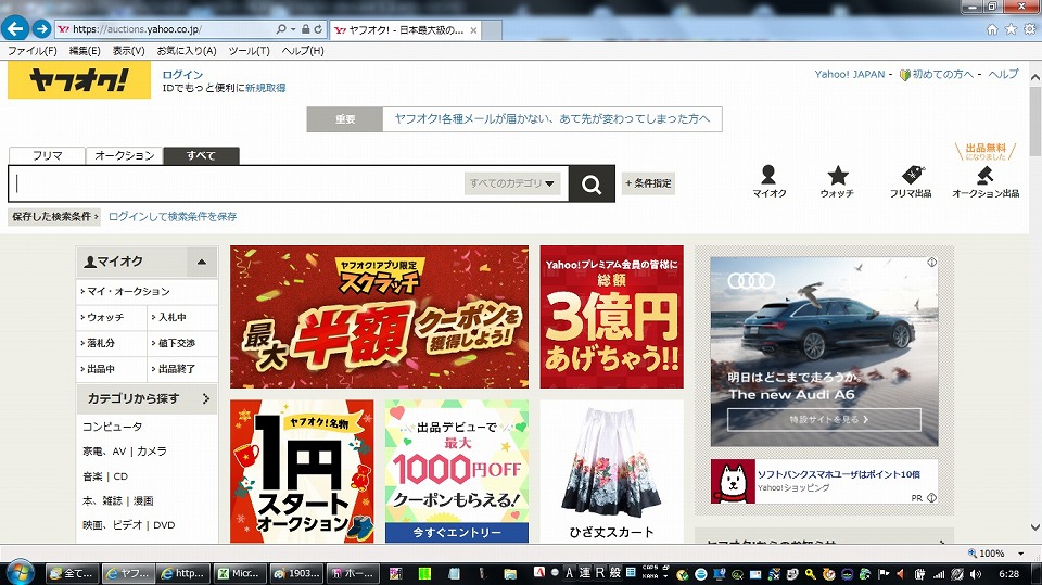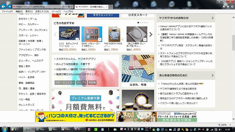 | まず、基本の3パターン。 その1。 ヤフオク!のトップページの最上部。 この段階ではディスプレイ下部には広告は表示されない。 |