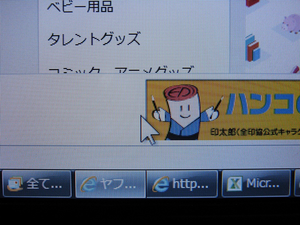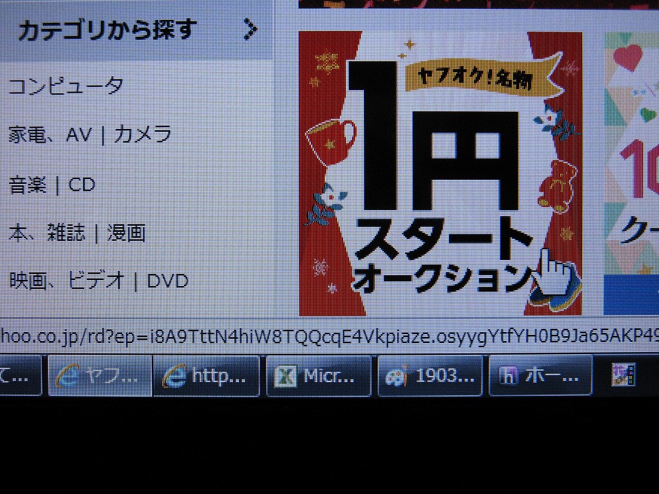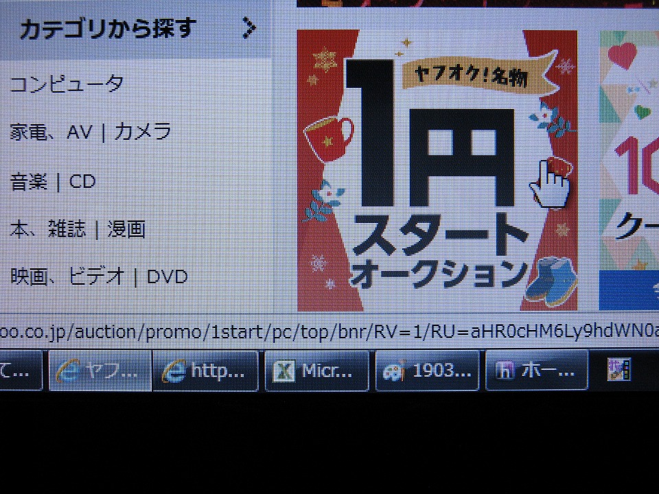 | 「ハンコ協会」の広告バナーが表示されていた辺りより上にポインターを持って行くと、 ほんの少しの「クリック不可」の領域があり、それを超えると再びポインターがクリックできる形に変わる。 すると、「1円スタートオークション」のバナー全体が少し淡い色に変わる。 また、ステータスバーに表示されるURLも変わり、「1円スタートオークション」のページに遷移することが分かる。 この説明の約33秒の動画はこちら。 |