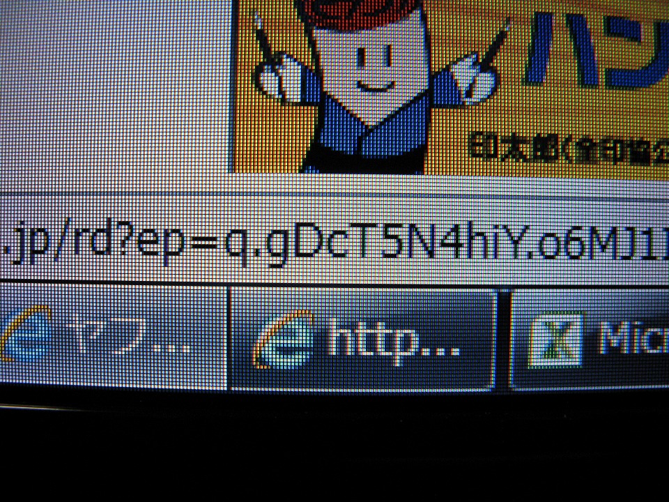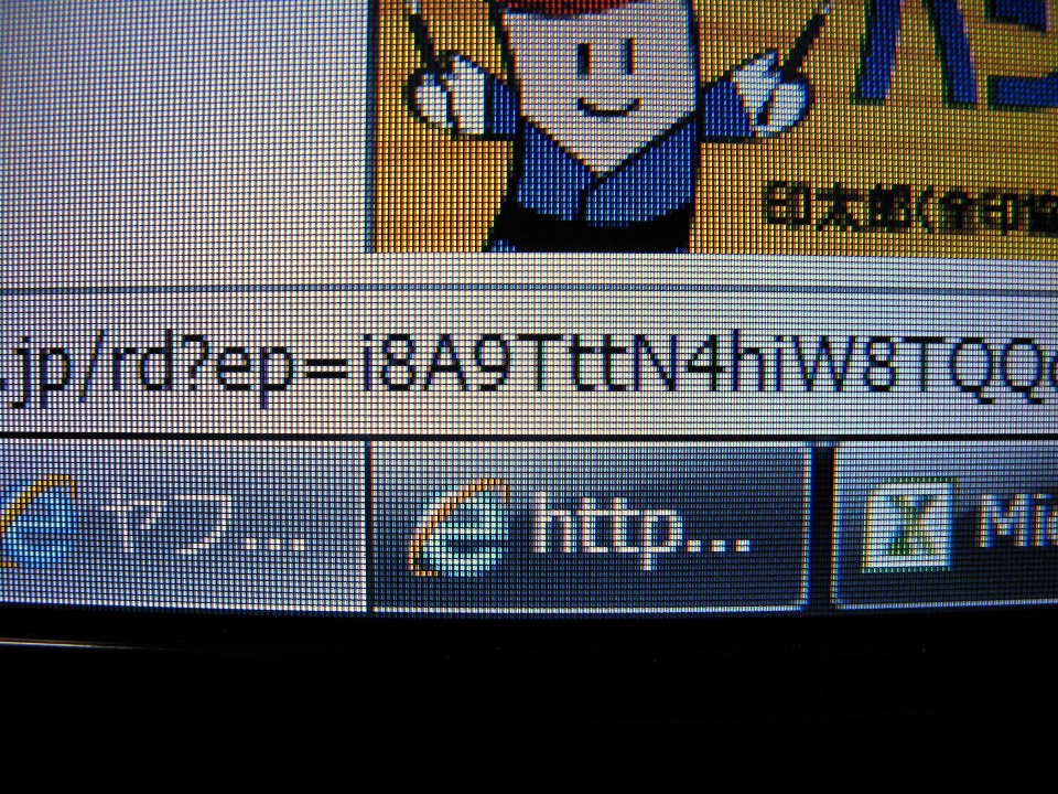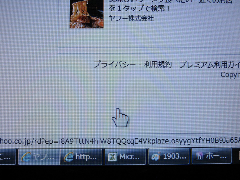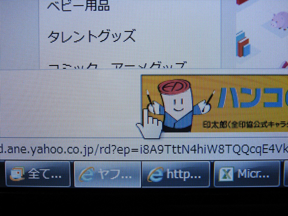 | このときの広告の左側の「ハンコ協会」の広告バナー上にポインターを置いたときに ステータスバーに表示されるURLの一部。 |