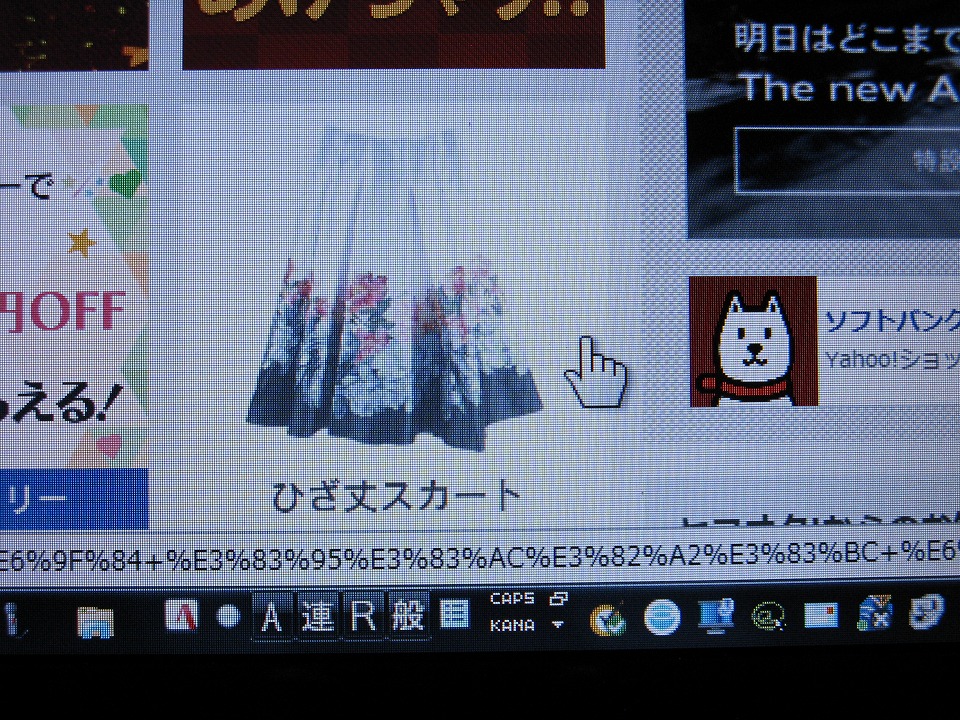 | 「セコム」の広告バナーが表示されていた辺りより上にポインターを持って行くと、 ほんの少しの「クリック不可」の領域があり、それを超えると再びポインターがクリックできる形に変わる。 すると、「ひざ丈スカート」のバナー全体が少し淡い色に変わる。 また、ステータスバーに表示されるURLも変わり、「ひざ丈スカート」のページに遷移することが分かる。 |