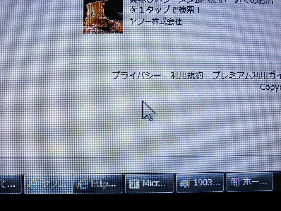 | その3。 トップページを最下部までスクロールすると、ディスプレイ下部の広告表示が消える。 この3パターンを踏まえて、以下で不具合を検証する。 PCのスクリーンショットを使うとポインターが消えてしまうため、 実際にディスプレイに表示された状態を、デジカメで直接撮影した。 |