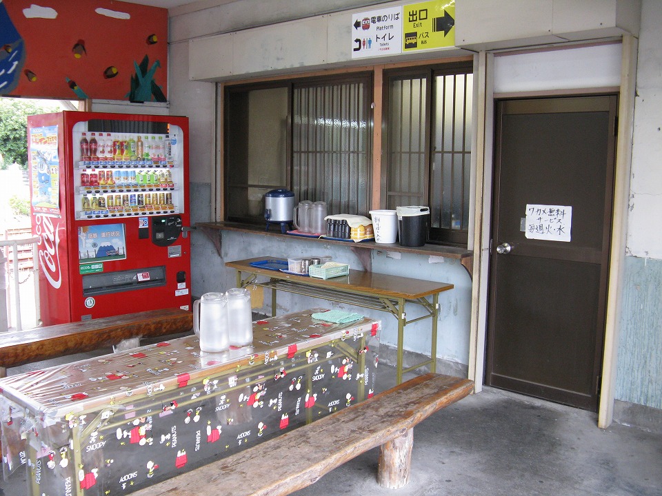 | 駅の待合室は、まるでそば屋の店内だった。 写真右に写っているドアを開ければ店に入れるが、 待合室のこのレイアウトからすれば、 待合室でそばをすするのも当然アリな気がする。 平日の状況を見たいね。 |