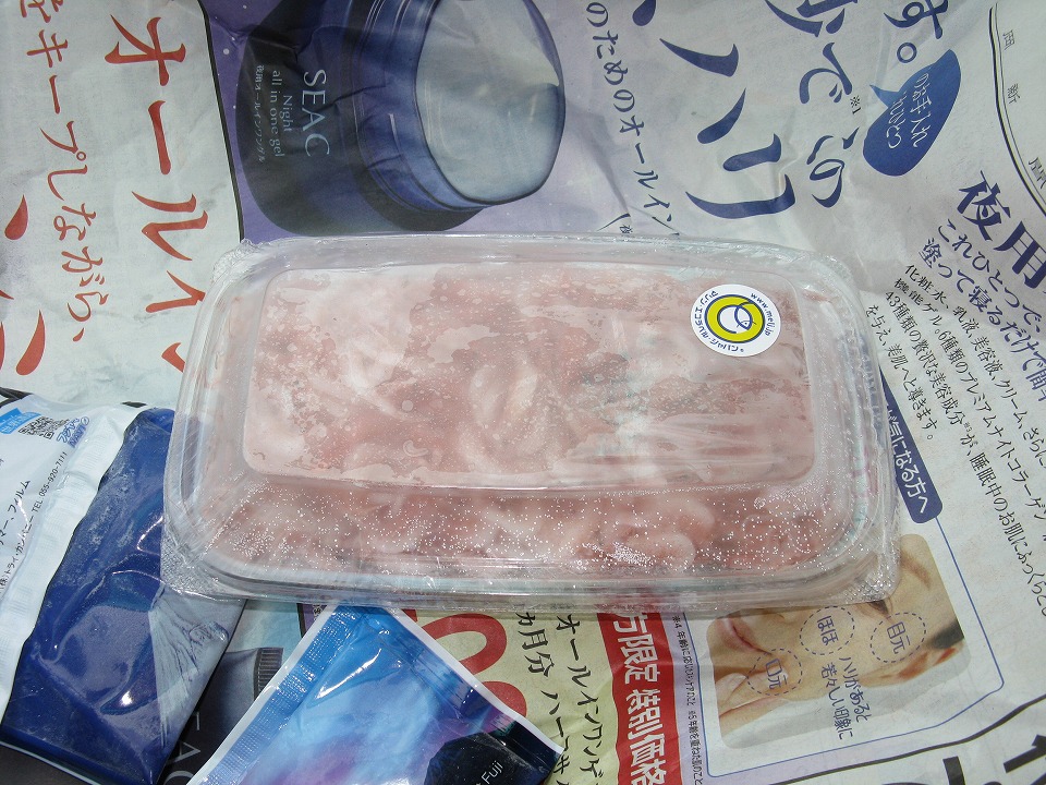 | そしたら、冷凍物ながら僅かにありましたよ! 迷わずGETする。 100gで1,000円ぐらいだったような…。 他の物と一緒に買い物したのでしっかり憶えていない。 買ったらすぐに、クルマに積んである電気冷蔵庫にしまう。 いや~立ち寄ってよかった! |