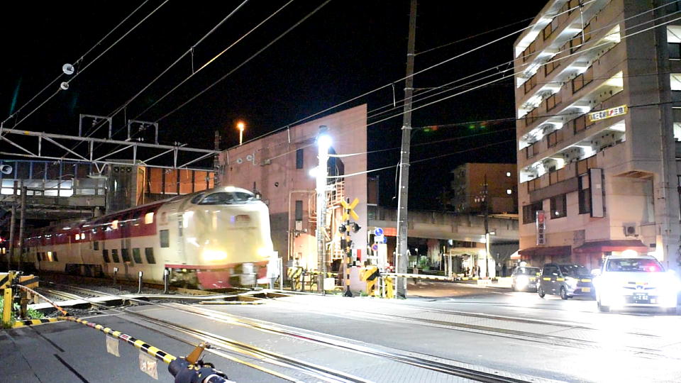| 宿で2時間ちょっと仮眠して、 0時を過ぎたら三脚を担いで、宿から歩いてすぐの踏切に来た。 ここで「サンライズ出雲・瀬戸」を狙う。 約35秒の動画はこちら。 俺の後ろには商店街があり、この時間だとまだ営業している店も多く、 酔っ払って店の前で大声で騒いでいるにいちゃんもいた。 三脚を立ててカメラを構えている俺に絡んできたり、 収録時に騒がれたらヤだなと思って警戒していたが、 幸い何もなかった。 |