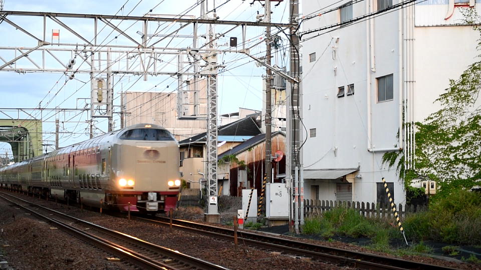 | 続いて本命の「サンライズ出雲・瀬戸」。 GWの頃なら、もうかなり明るくなっている。 約40秒の動画はこちら。 |