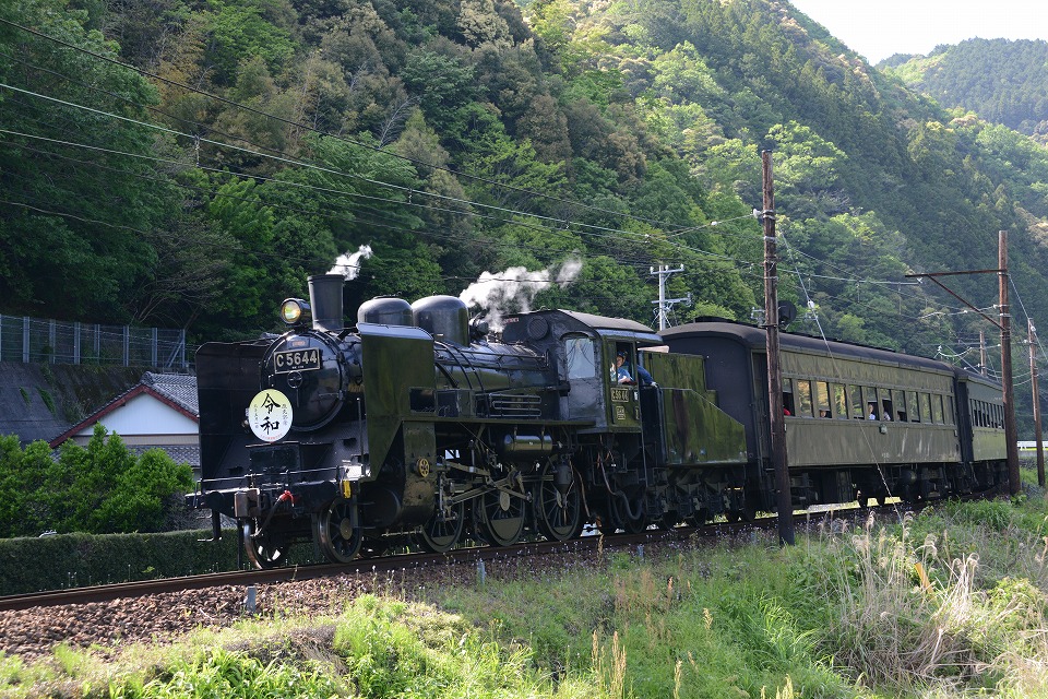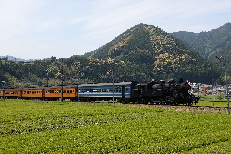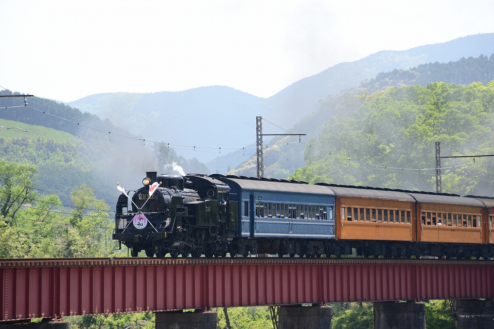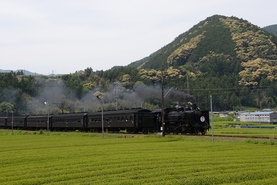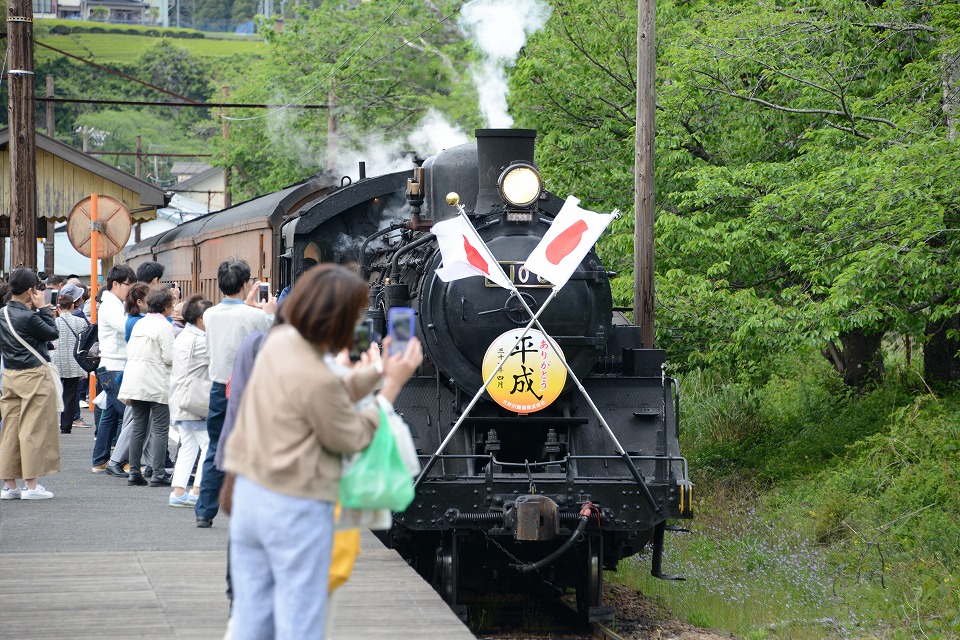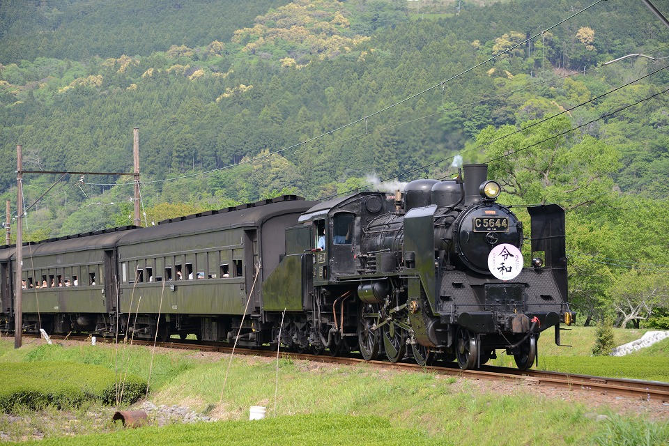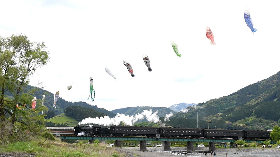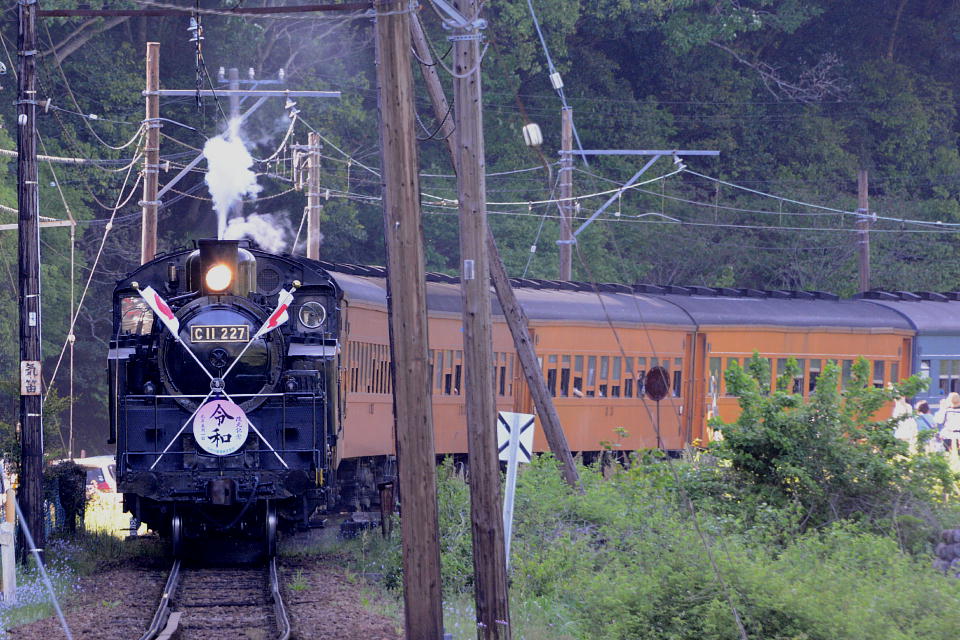 | GW中のみ、4月は「平成」、5月は「令和」のヘッドマークを付けて走る。 1本目の1003レは、ぶどう色2号(ぶどう色といってもつまり茶色。)の客車。 2本目の101レは、トーマス用のオレンジ色の客車+日章旗。 という組み合わせで走るとのこと。 午後の上りの1004レと102レも同じパターン。 列車を引っ張るSLは、その日によって変わるらしい。 なお、この先同じような写真が続きますが、 これは、同じ撮影ポイントでも、そのときの天気や風によって写りがビミョーに変わるので、 少しでもいい具合の撮影ができるように期待して毎回臨んでいたためなので、 どうかご勘弁ください。 この写真は、1本目の1003レ。 約40秒の動画はこちら。 |