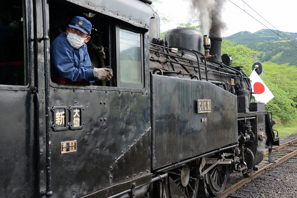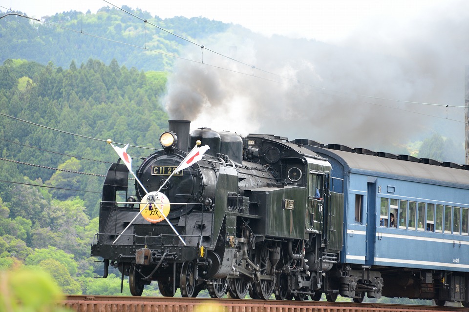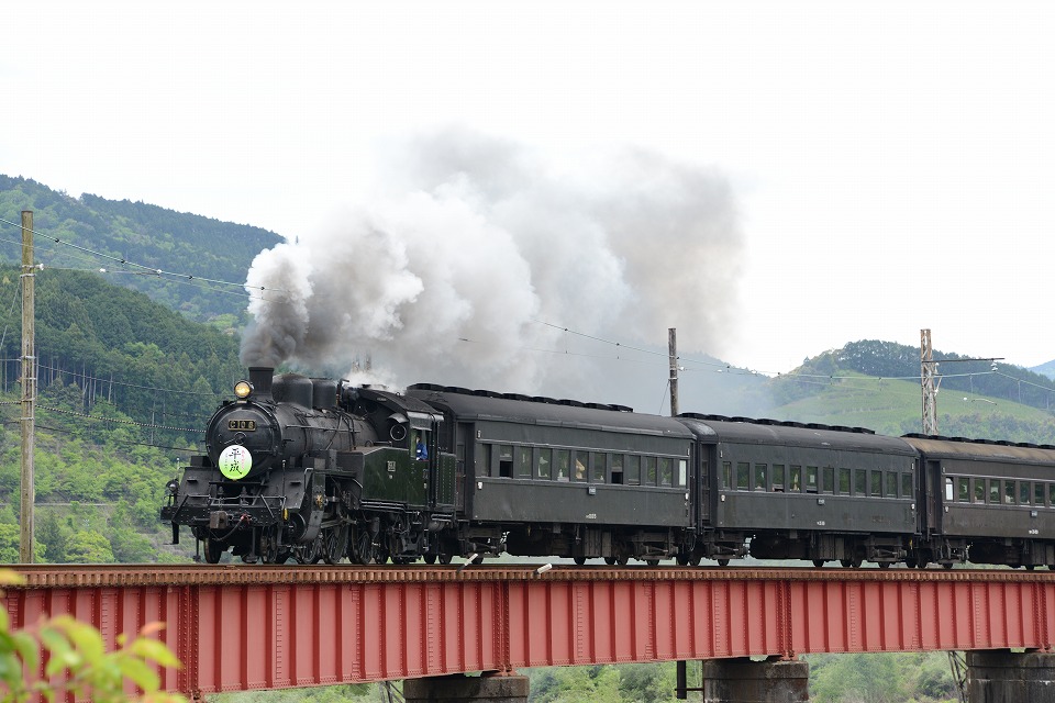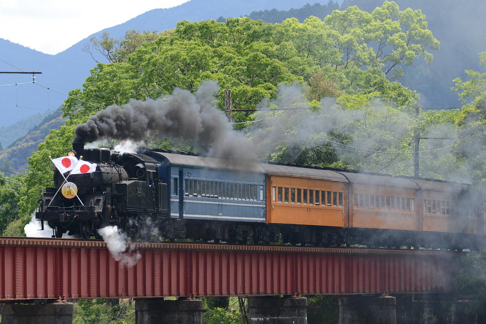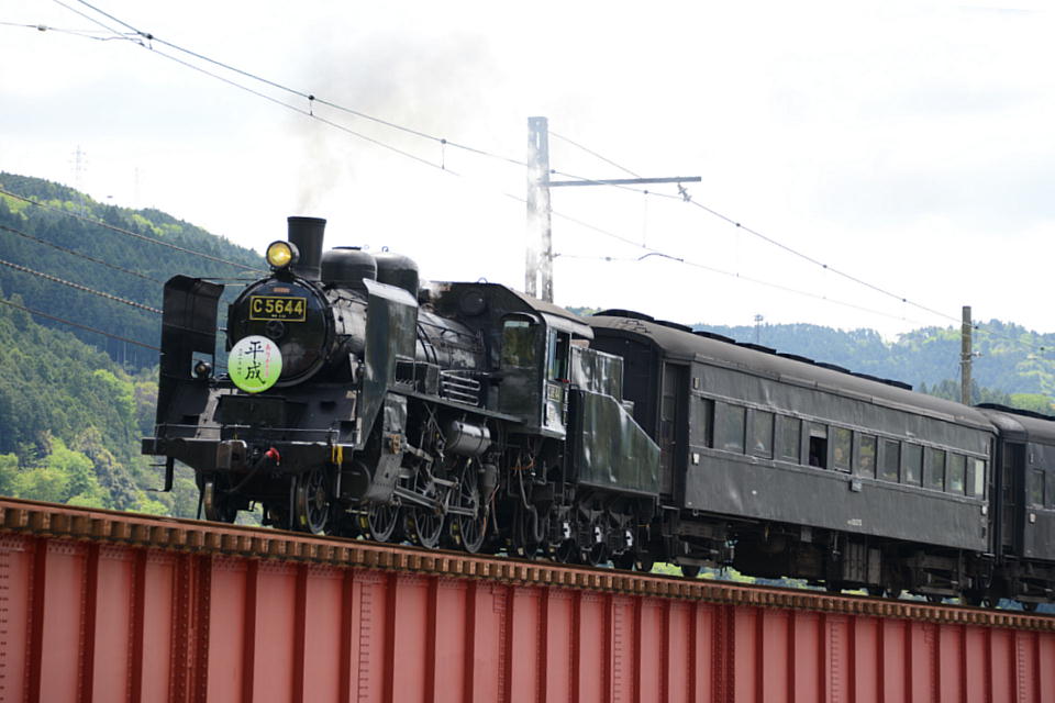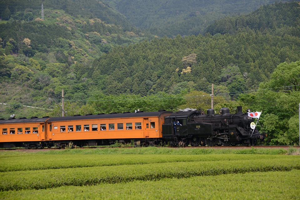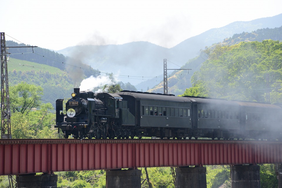 | GW中のみ、4月は「平成」、5月は「令和」のヘッドマークを付けて走る。 1本目の1003レは、ぶどう色2号(ぶどう色といってもつまり茶色。)の客車。 2本目の101レは、トーマス用のオレンジ色の客車+日章旗。 という組み合わせで走るとのこと。 午後の上りの1004レと102レも同じパターン。 列車を引っ張るSLは、その日によって変わるらしい。 なお、この先同じような写真が続きますが、 これは、同じ撮影ポイントでも、そのときの天気や風によって写りがビミョーに変わるので、 少しでもいい具合の撮影ができるように期待して毎回臨んでいたためなので、 どうかご勘弁ください。 この写真は、1本目の1003レ。 約40秒の動画はこちら。 |