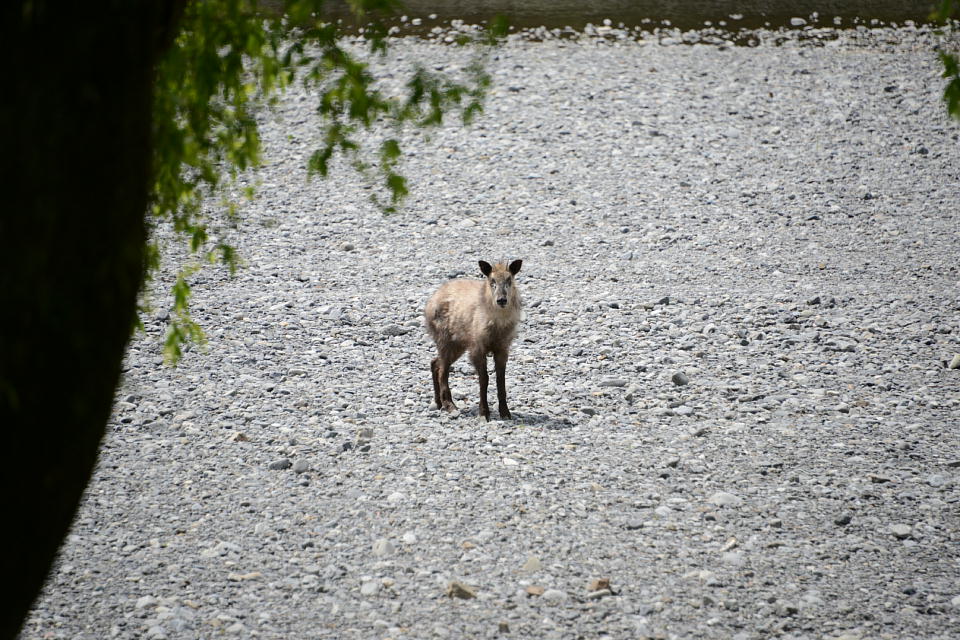 | SLを待っていると、大井川の河原を1頭のカモシカが通った。 途中で立ち止まり、カメラマンたちがいるエリアをじぃ~っっっと見ていたが、 そのうち上流の方へ歩いていった。 |