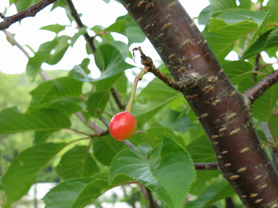 | 道の駅川根温泉に着いた。 ここは、大井川鐵道がカーブしながら大井川を渡る大井川第一橋梁のすぐ脇にあり、 駐車場も撮影ポイントも十分なキャパがあるらしいし、何よりトイレと温泉もある! 清水に住んでいた高校時代に、鉄道で沿線を撮影して歩いたことがあるとはいえ、 ほぼ「大井川初心者」の俺は、とりあえずの撮影ポイントとして、この道の駅を選んだ。 実際「撮影するだけ」ならかなりのキャパがあったが、 アングルや光の具合を考えるとポイントは自然に絞られていき、 やはりそういう場所には「そのスジの方々」がものものしい装備で既に三脚を立てていた(笑)。 俺もその一角になんとか混ぜてもらった。 その場所にあった桜の木にサクランボがなっていた。 |