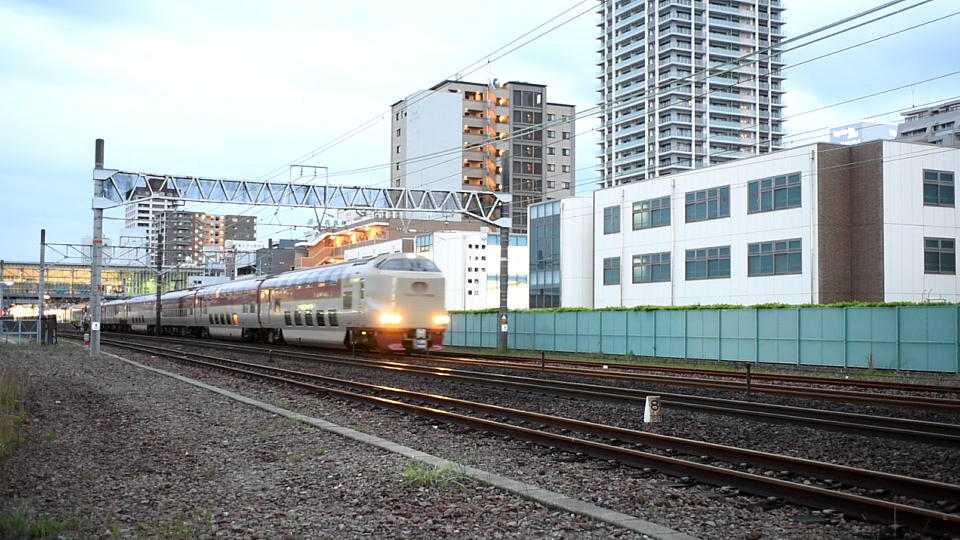 | 宿でサクラエビをツマミに呑んでたら、 これまでの寝不足もあって、あっという間に沈没してしまい、 0時頃の下りの「サンライズ」の撮影ができなかった。 朝はなんとか起きて、清水駅のすぐ近くで上りを撮影した。 約40秒の動画はこちら。 |
