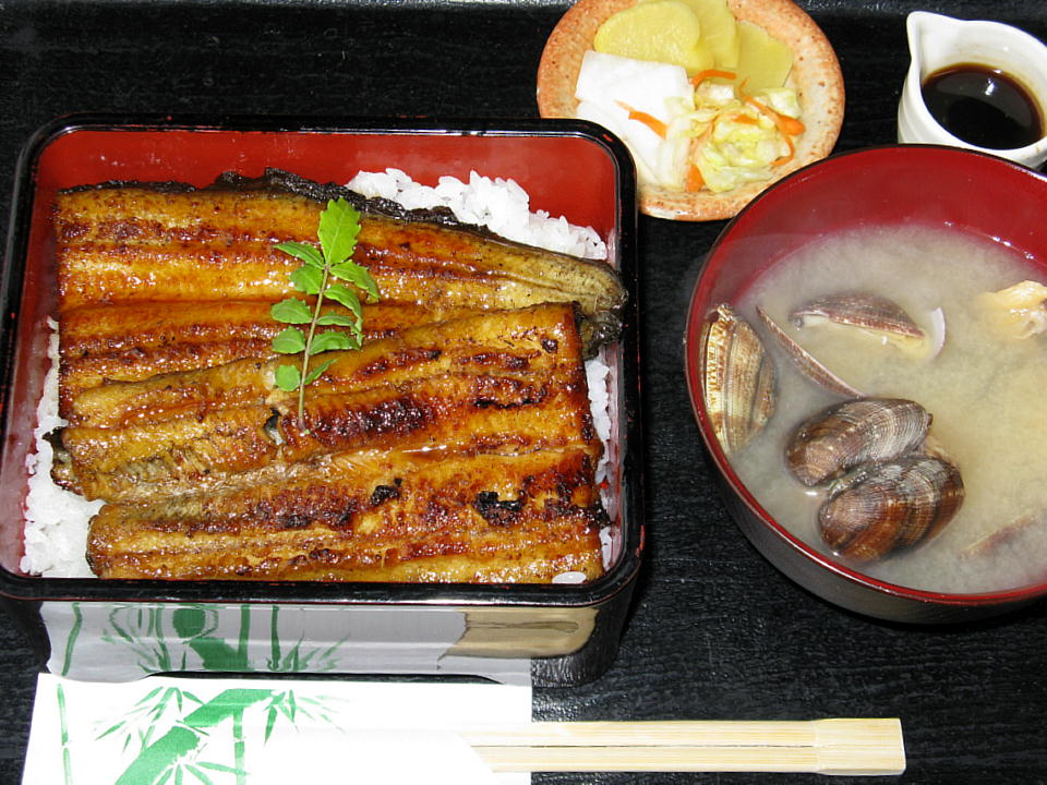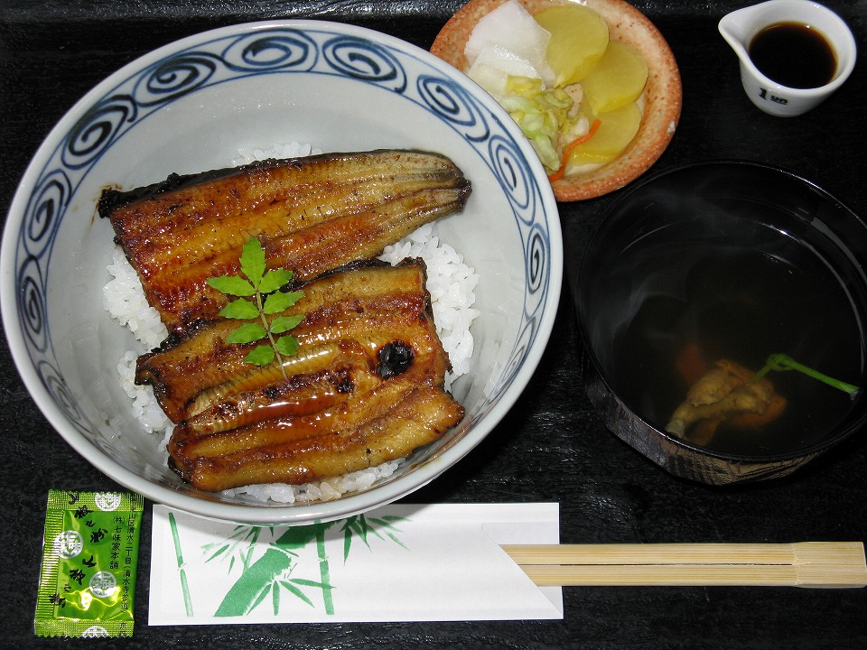 | お待ちかねの「天然極上うな重(太)」5,000円ナリ。 いい匂い~。いただきま~す。 天然物は太いほど脂が乗っているというが、 養殖物に比べると圧倒的にさっぱりしている。 それでも、天然物を何回か喰ってきている中で、 今回のものは1番脂が乗っていたと思う。 これまでは「さっぱりしている」を通り越して、 「パサパサしている」と感じたことが多かった。 |