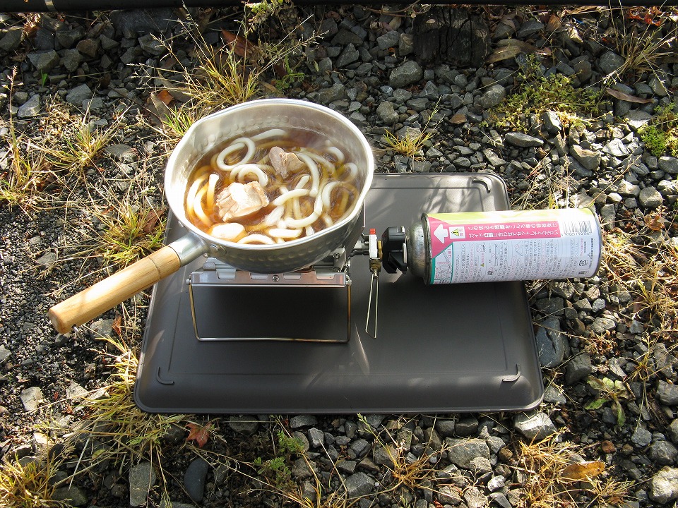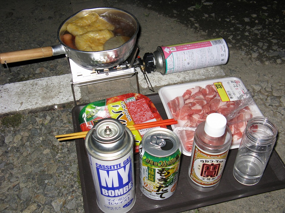| 朝になると当然ハラが減るので、うどんを拵える。 このチープ感がいいでしょ(笑)。 5月になってからの文面は、 いかにも「発作的に出発」したかのように感じるかもしれないが、 実際は、カネがないことから、したたかに自炊の準備をしてあったのだ。 住まいの近くのビッグ(イオン系)では、袋入りの茹でうどんを21円で売っているので、 それをしこたま買い込んで、外食は一切しないと誓ったのだ。 そして、鶏モモ肉を塩で茹でてタッパーもどきに詰めて、 旅中のうどんの具や酒のツマミとして活躍させる。 電気冷蔵庫をクルマに積んでいるからできる芸当だ。 |