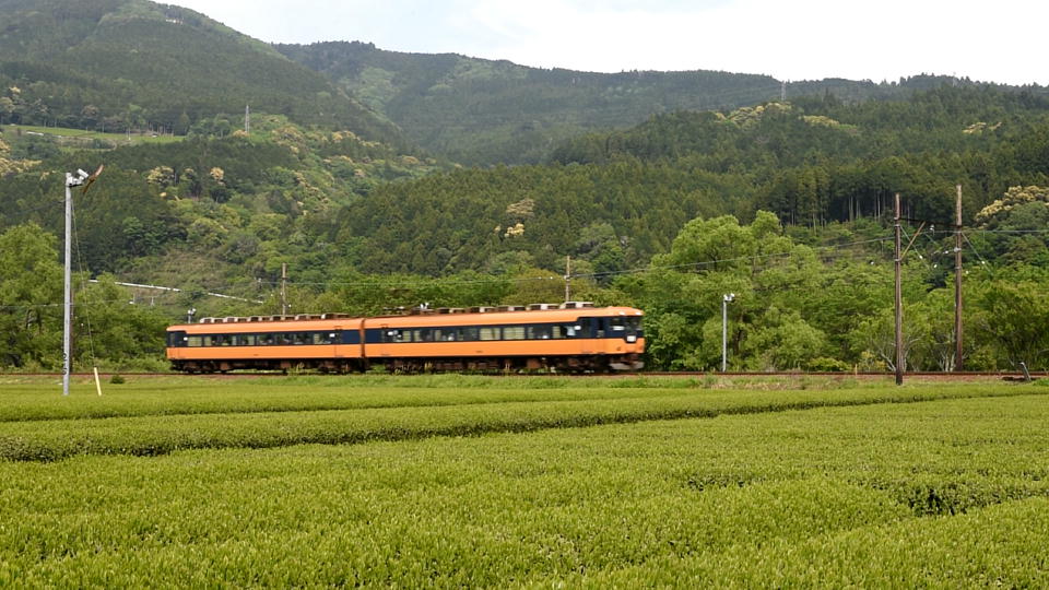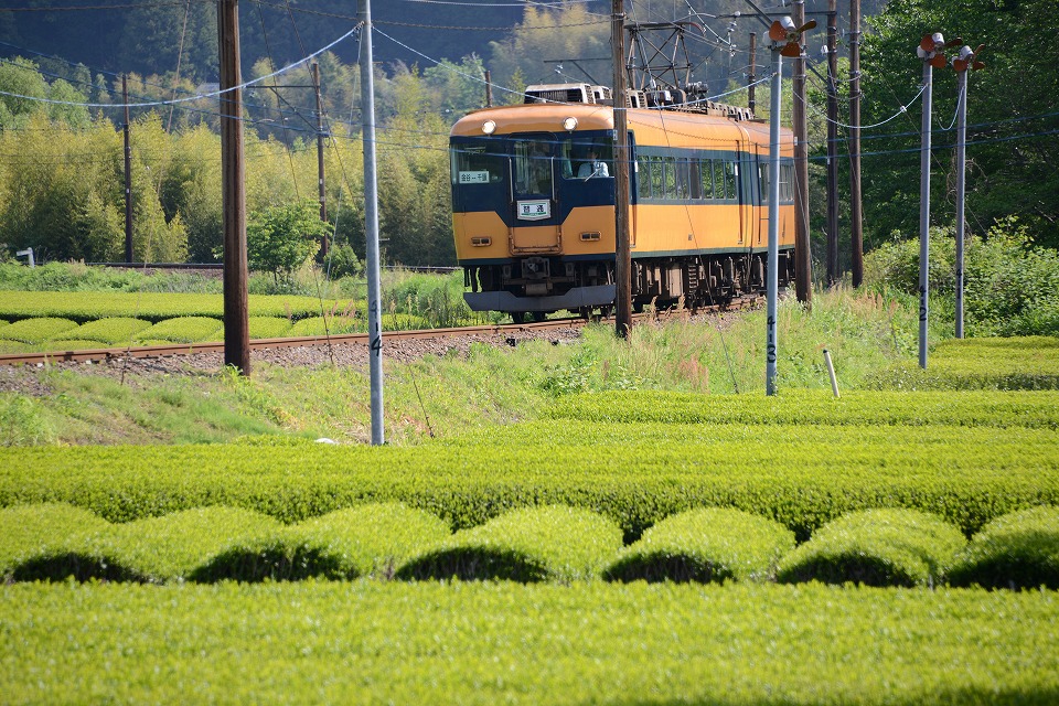 | さて、夜が明けて、今日も気持ちのいいお天気。 そろそろ下りもポイントを変えようと思い、 ネットでいろいろと確認して、ちょうど季節的にもいいお茶畑で撮影することにした。 この写真はただ撮影しただけ。 電車の前面に電線がかかっている…。 |