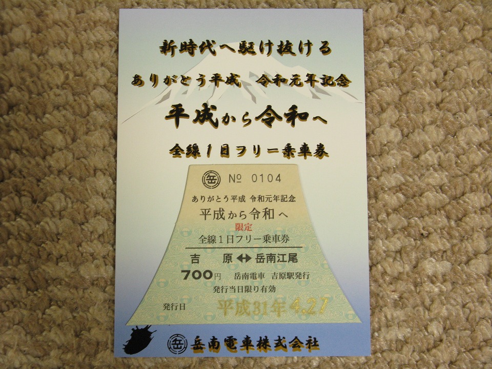 | 始発の吉原駅で、今日から発売になった記念切符をGETする。 嬉しいことに硬券だよぉ。 なんと富士山型。 こんなの今までなかったよね。 しかも、発行日付印のインクがゴールドっ! 頑張ってアイディアを出したんだと思う。 |