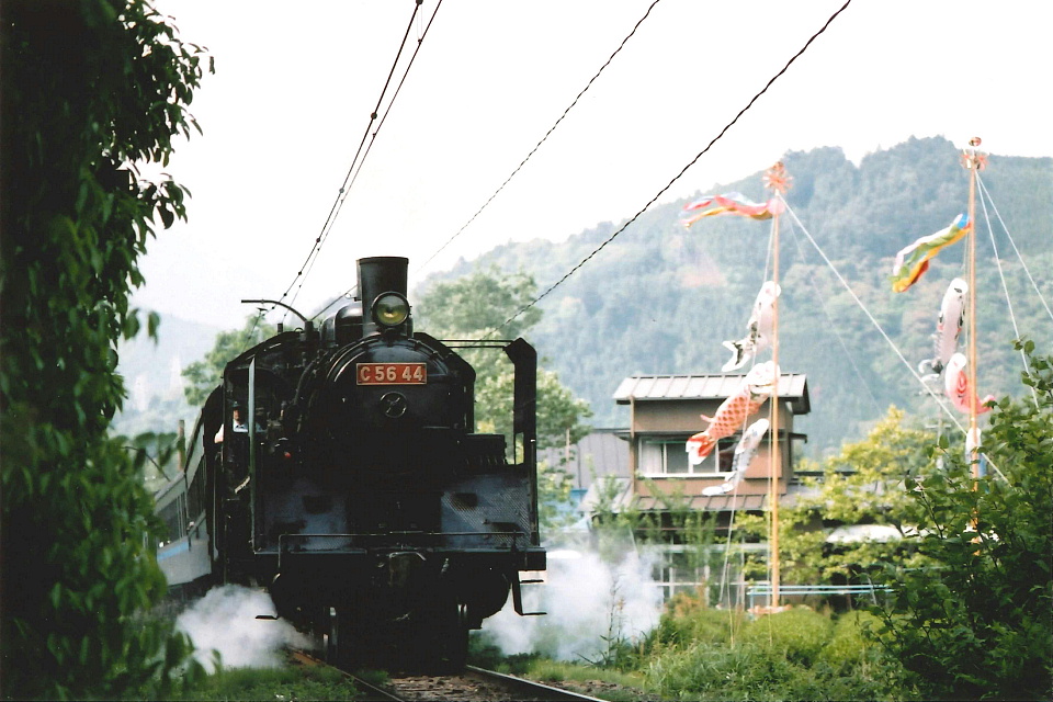 | 【おまけ】 1985(昭和60)年(さ…さんじゅうよねん前…。)のGWの、 大井川鐵道のSL「かわね路号」。 この写真をこのページにUPするにあたり、久しぶりに「ネガプリント」した。 そして、その写真をスキャンした。 意外に退色はなく、当時の色合いを良好に保っていると思う。 撮影場所は、駿河徳山駅附近だという記録は残してあったが、 ピンポイントとしては分からない。 現代のストビューでも分からなかった…。 俺はこの写真をどこで撮ったんだろう??? |