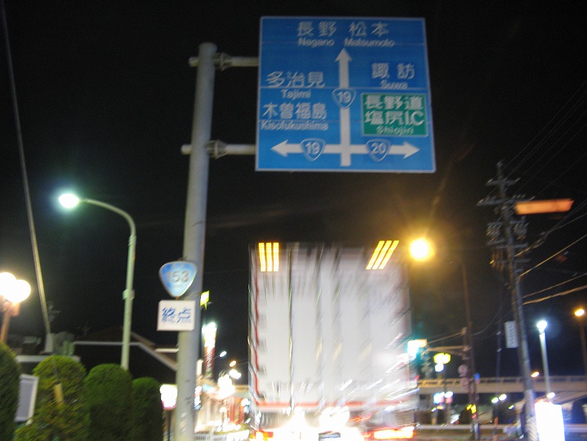 | 三遠南信道と国道151号を使って長野県に入り、 根羽村などのスーパーで地元のお豆腐などを確保して、 飯田市から国道153号と一部中央道を通り、 やっと塩尻市の国道153の終点に着いた。 ここはランドマークで、 名古屋から伊那谷経由の国道153号(この道)の終点だし、 東京から甲府経由の国道20号(右からの道。)の終点だし、 名古屋から木曽経由の国道19号(左から&直進の道。)の接続点である。 この交差点を直進して、国道19号で松本を通り、長野へ帰った。 この写真は、 交差点でちょうどよく「赤タン半固」になったんで撮影しようとしたら そのとたんに「青タン」になっちゃって、発車せざるを得ず、 発車しかけたときにシャッターを切ったんで、こんなブレブレになったもの。 |