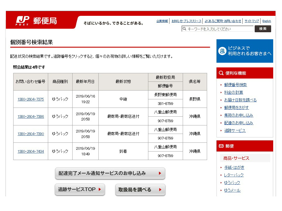 | ここでは詳しく書かないが、与那国島に向けて ゆうパックを3個+1個の計4個を発送してある。 後から送った1個が先に届き、 先に送った3個が「3個口」であるにも関わらず、 ステイタスが異なっていて、ちょっと不安だ。 まあ、飛行機に乗せてくれさえすれば、 とりあえず安心していい。 ※この翌日に全て先方に届いたよ。 |