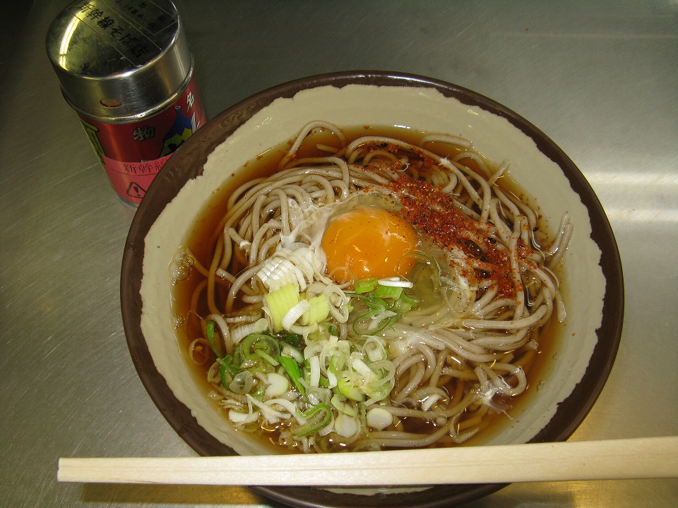 | 長野駅の新幹線ホームで「行ってきます」の一杯をすする。 きつたまそば360円ナリ。 |