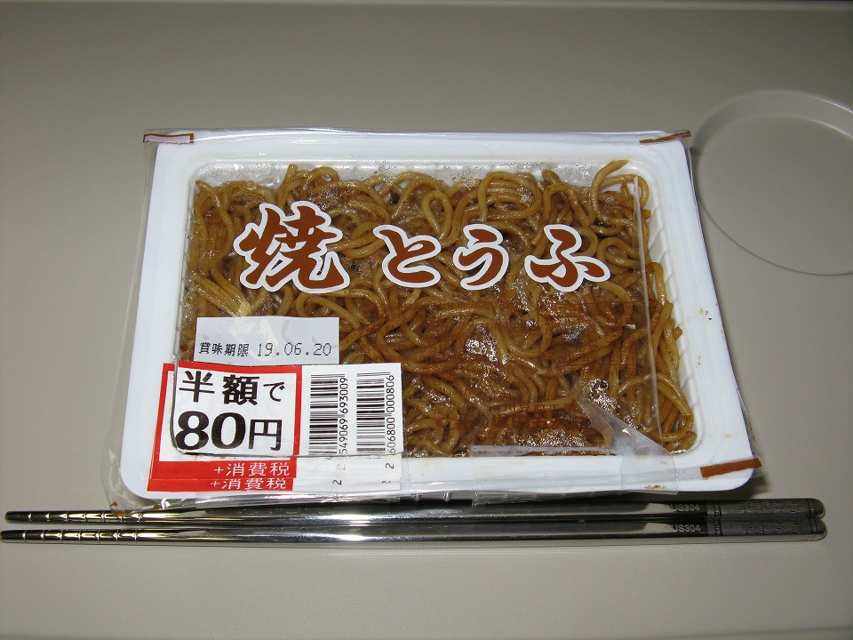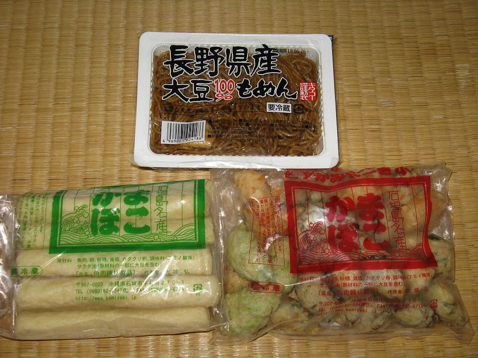 | 朝メシ。 買ってきたかまぼこと、 俺名物の「豆腐容器やきそば」。 ところが、このやきそばが少し傷んでいたので、 ちょっと喰ったところで、やきそばは喰うのをヤメました。 |