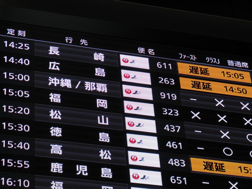 | 東京駅と浜松町駅でのそれぞれの4分の乗換をスイスイとこなし、 羽田空港に着いた。 JAL919便那覇行きは満席だね。 |