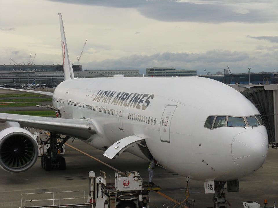 | JAL919便那覇行き。 B777-800。 JA8945 今回は、JTAの石垣直行便が、 事前予約開始日でも取れなかったので、 やむなく那覇経由とし、 石垣島に「前泊」することにした。 |