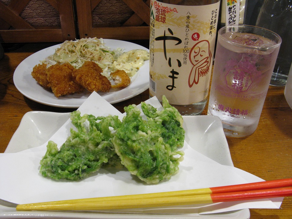 | 石垣空港からバスで市街地に移動し、 いつもの「民宿さくま」にチェックインしたら、 ささっと水シャワーを浴びて、 早速いそいそと「南の島」で呑む。 オリオンの生を2杯すぐに空け、 しまーをクイクイやりながら、いろいろつまむ。 いや〜、で〜じま〜さんど〜! |