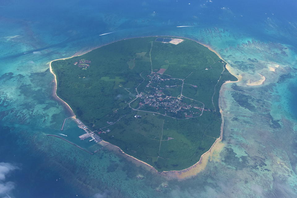 | 南に向けて離陸して、ぐい〜んと右に旋回したら、 竹富島がよく見えた。 |