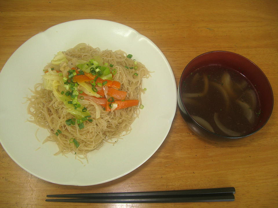 | 昼メシはビーフンだ。 ニンニクが軽く効いていて、ま〜さんど〜。 |