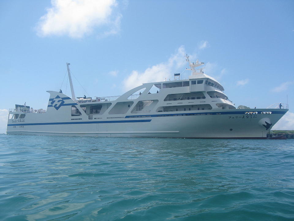 | 2本目の出航を待っていたら、 石垣から「フェリーよなくに」が久部良(くぶら)港に到着した。 ところで、2本目に持って行くはずだった カメラのハウジング(防水ケース)が浸水したため、 カメラを持って行くのはヤメた。 1本目とは違うハウジングを使ってみたが、どこから浸水したかな〜。 |