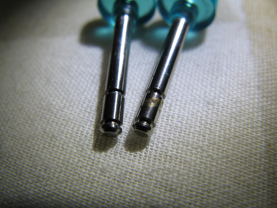 | げげげ、ボタンの1つの周辺が茶色(サビ) になっているのを発見し、慌てて分解した。 各部品を拭いて、防水ケースのこの部品が収まる部分を清掃した。 ボタンの部品の軸にサビがあり、素材にまで浸食していた。 こういうことはある程度想定内だったので、 メンテナンス用に持ってきていた部品の中から 同じ物できれいな物と交換した。 写真はもちろん、左が交換後のきれいな物で、 右が防水ケースから外したサビが発生した物。 |