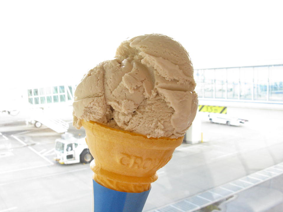 | 石垣空港で、売店でのアイスの割引券をもらったんで、 「ブルーシール」のサトウキビ味を喰う。 ちべたくて、ま〜さんど〜。 |