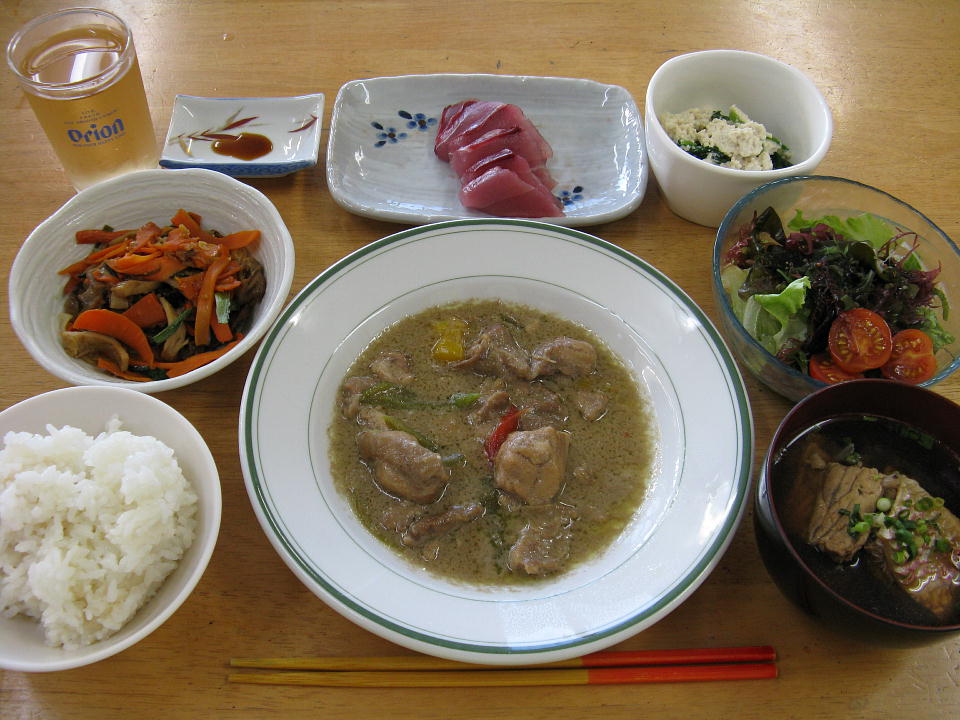 | 与那国島最終日の朝メシ。 2時頃にフト目が覚めたので、 外に干しているダイビング器材を取り込むため (スコールが降るとせっかく乾いたのにまた濡れるから、 夜中でも器材の取り込みをすることがよくあるのだよ。) に外に出たら、満天のオホシサマ。 天の川もきれいに見えた。 |