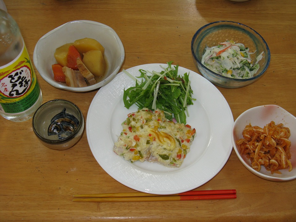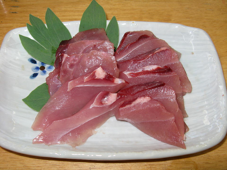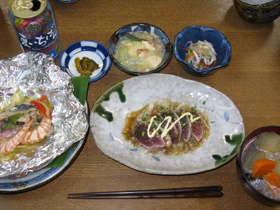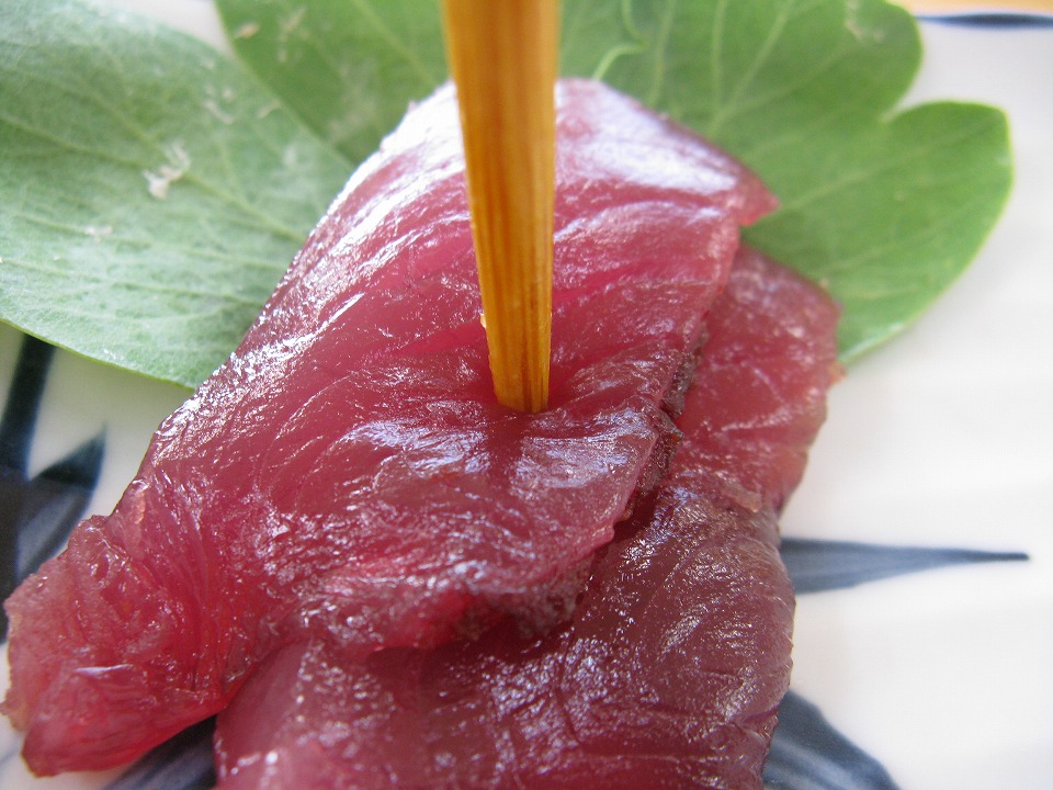 | 今日は、獲れたてのカツヲの刺身が付いた。 ちょっとお行儀が悪いが、この写真では、 うめーし(お箸)でカツヲ刺しを刺してみた。 刺さっているように見えるが、 実は刺さっていなくて、弾力で跳ね返される。 もちもちしてて、何と旨いことか。 これを喰っちゃうと、内地のグズグズカツヲなんて 喰えなくなっちまうんだね。 |