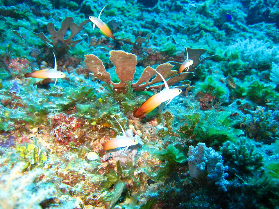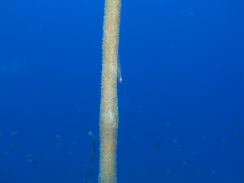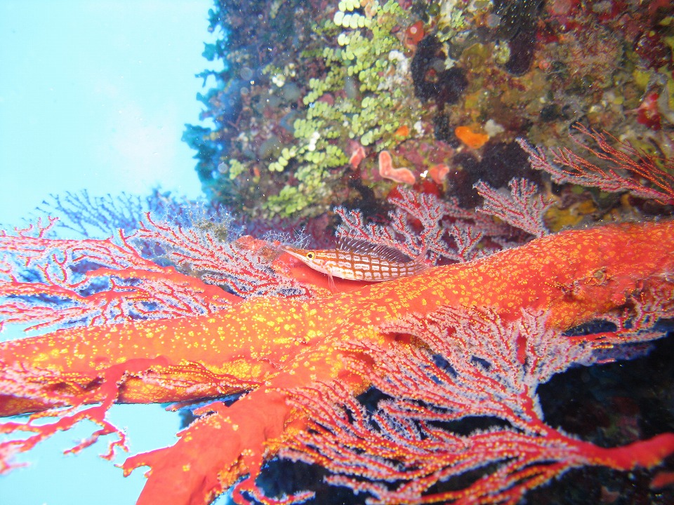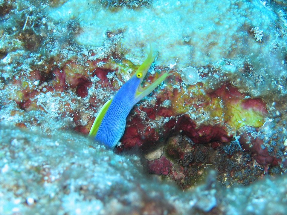| 1本目はサンゴと地形を楽しめる 久部良バリ。 色鮮やかな、ハナヒゲウツボ。 ピントが魚の目から外れてしまった…。 |