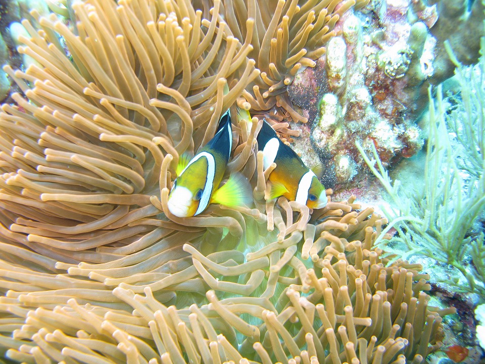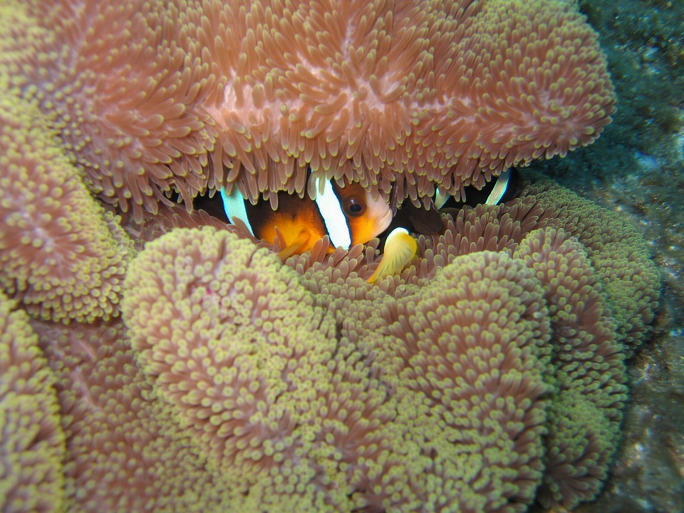 | イソギンチャクの下で守られているクマノミ。 |