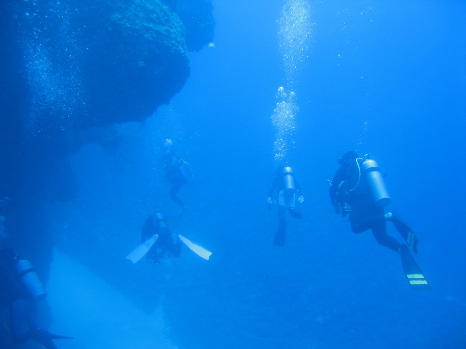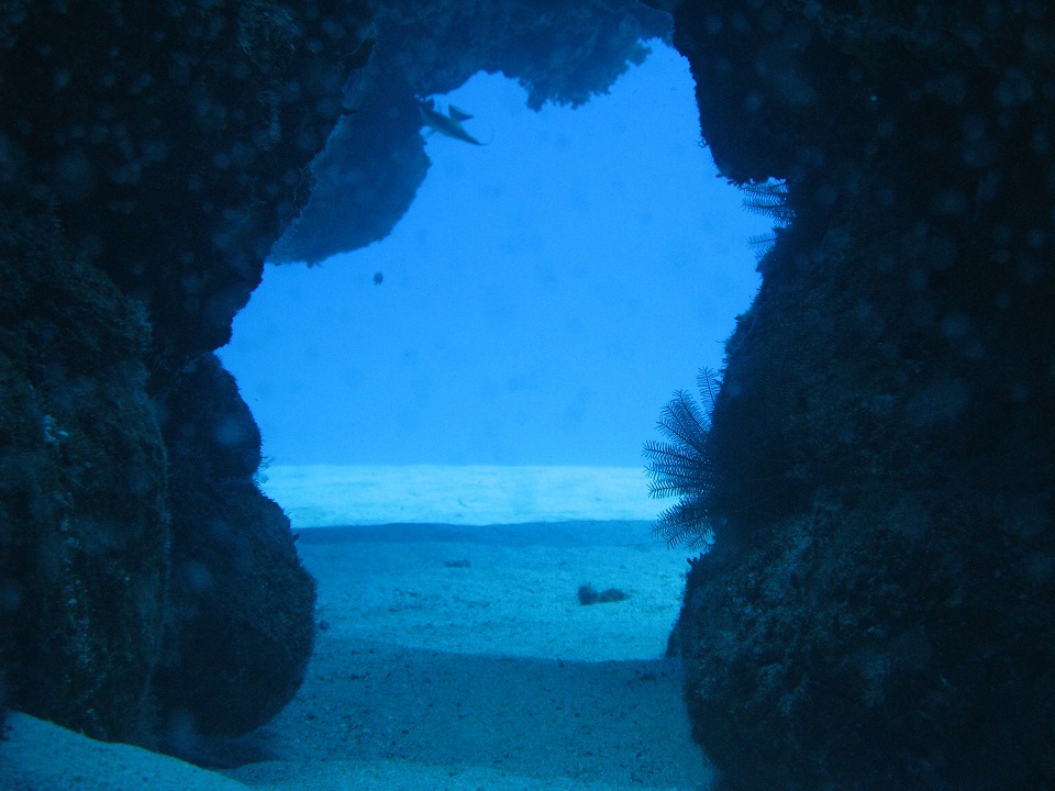 | 南風が強いので、午後は出ずっぱりで島の北側で潜ることになった。 午後の1本目は、砂地と根のポイント。 洞窟ではないが、岩の間から砂地。 |