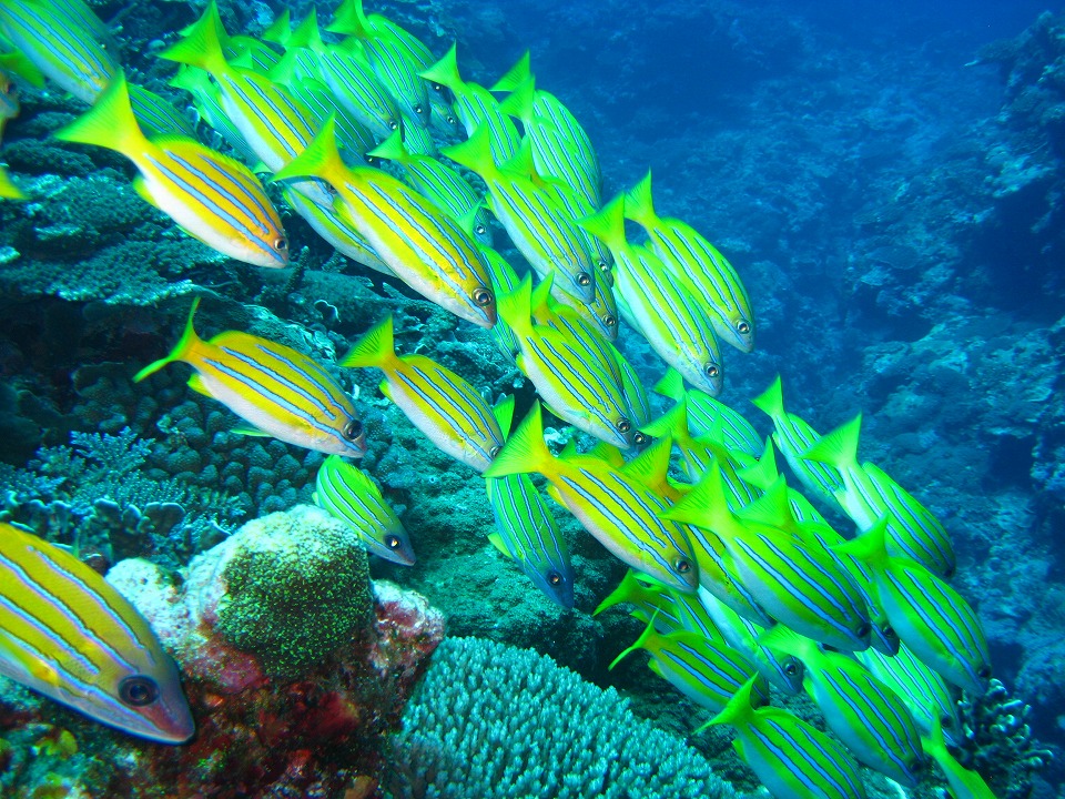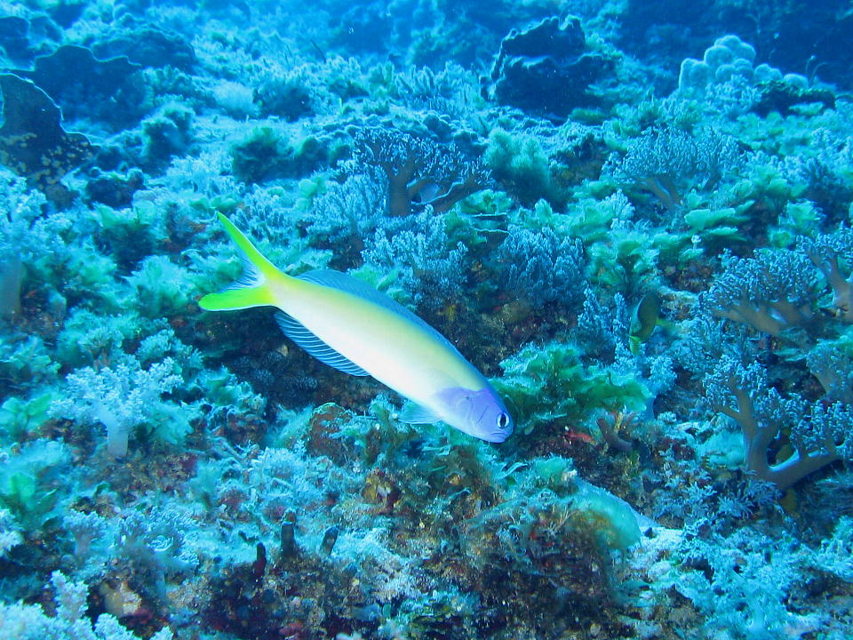 | ヨスジフエダイ。 黄色が鮮やかなお魚。 GoProもどきの格安中華機の2K60fps(フルHDの60フレーム/秒) で撮影した約20秒の動画はこちら。 編集なしの約26秒の動画はこちら。 |