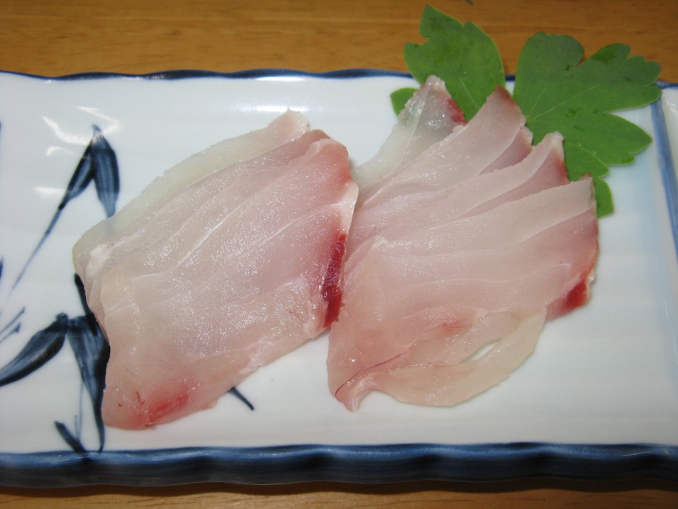 | これが、オオグチマチの刺身。 釣りたてで、弾力があって、で〜じま〜さんど〜! |