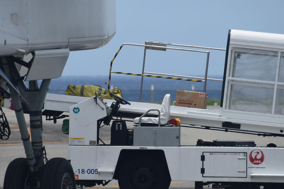 | さっき久部良簡易郵便局から発送したゆうパックの器材と生活物資も 同じ機に積み込まれた。 そういえば、自分の差し出したゆうパックが 同じ機に積み込まれるのを見るのは初めてだ。 |