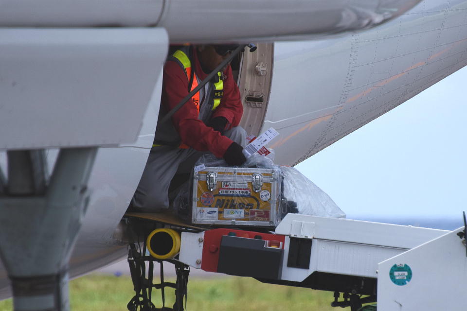 | さっき、空港のカウンターで預けた俺のカメラバッグもちゃんと積み込まれた。 そういえば、自分預けた荷物が 飛行機に積み込まれるのを見るのも初めてだ。 |