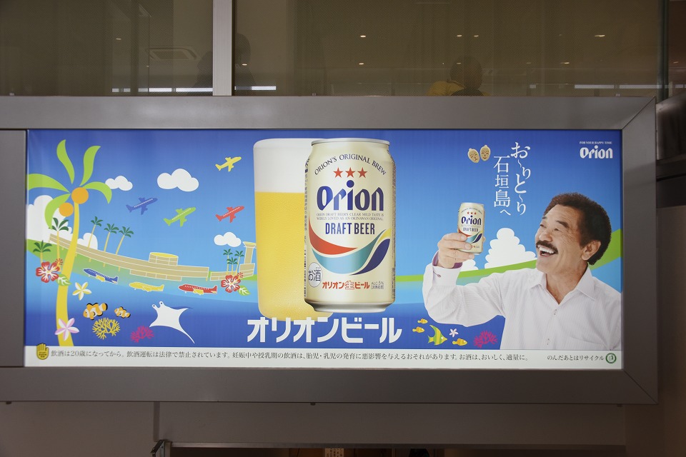 | サクッと飛んで石垣空港に着陸した。 具志堅用高さんとオリオンビールがお出迎え。 |