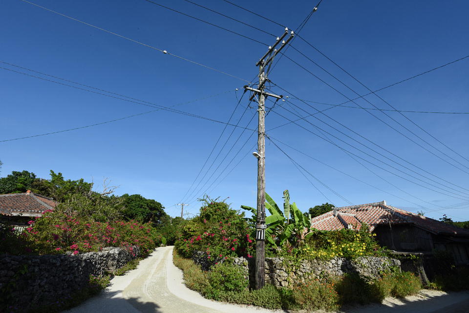 | ちょっと傾いて立っている木製の電柱も貴重。 木製の電柱は竹富島ではまだかなりの数を見ることができるが、 そのうちコンクリート柱や鉄柱になっちゃうのかな。 |