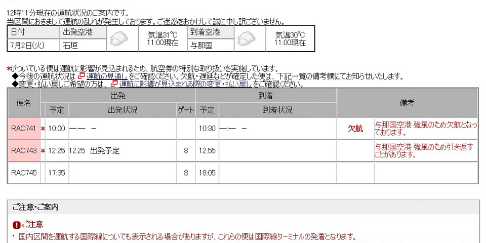 | おい〜、冗談じゃね〜ゾ。 与那国空港が強風のため、 まず、朝イチの那覇〜与那国便が、 石垣空港到着に変更になったので、その影響で、 本来ならそのままま与那国から石垣行きになる便も当然欠航。 んで、石垣から与那国への午前中の便までも欠航。 さらに、昼の便も条件付きになっちまった! この便が与那国空港に来ないと、 その折り返しの、俺が乗る便も欠航してしまう。 なんだかな〜なんだけど、とりあえず翌日の朝の便をすぐにネットで予約し、 「欠航したら、午後からダイビングと、もう1泊ね。」と、こちらも予約した(笑)。 |