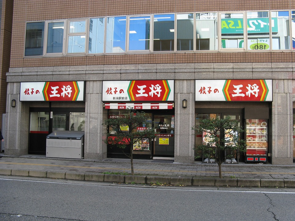 | 出発を前に、まずはハラごしらえ。 ・三越(閉店しました。)近くの「三吉屋」のラーメン ・子供の頃から好きな「吉野家」の牛丼 ・新潟駅前の「そばうどん」の手延べ麺のきつねうどん あたりが昼メシ候補に挙がったが、 結局、「王将」に決定した(笑)。 |