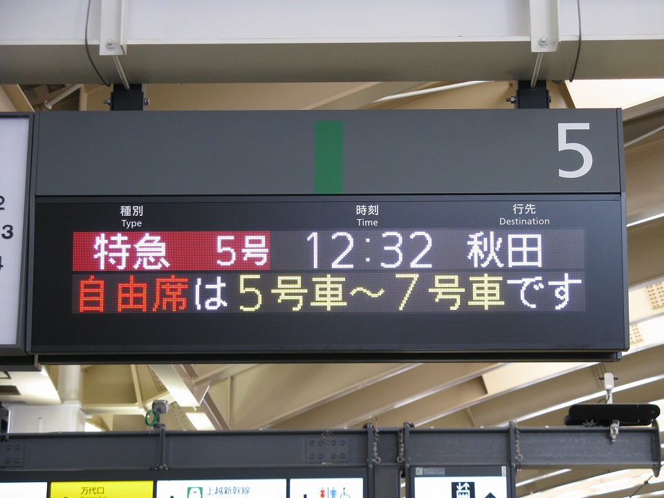 | 秋田行きの特急「いなほ5号」で、まずは村上を目指す。 表示は「特急5号」になってら。 列車の入線を待ってようと思いつつ、ふと隣の新幹線ホームに目をやったら… |