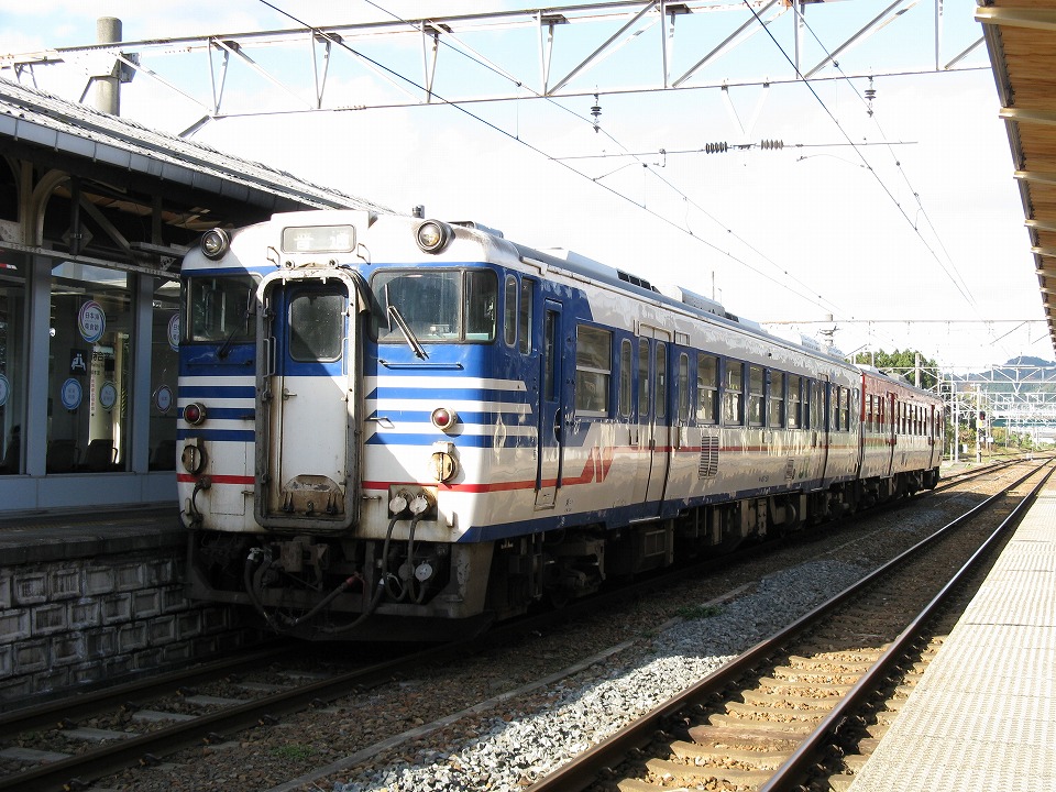 | 1時間弱で村上に到着。 国鉄時代のディーゼルカーが、 特急から連絡する普通列車として控えていた。 この車両(キハ47系)も近々引退する。 |