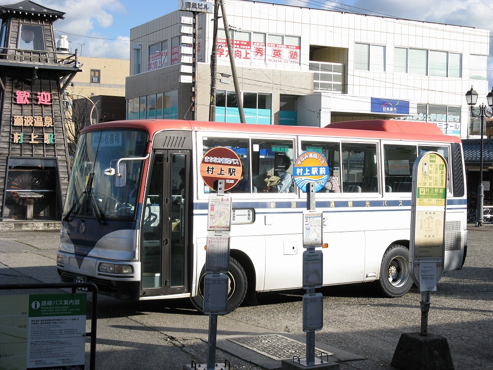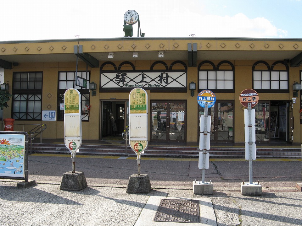 | 村上駅前って、ホントに駅の真ん前にバス停がある(笑)。 大抵は、駅前ロータリーのちょっと端ぐらいのイメージの場所だよね。 駅舎の上の時計が「取って付けた感」があっていいね(笑)。 |