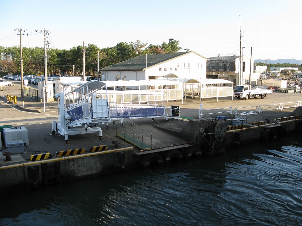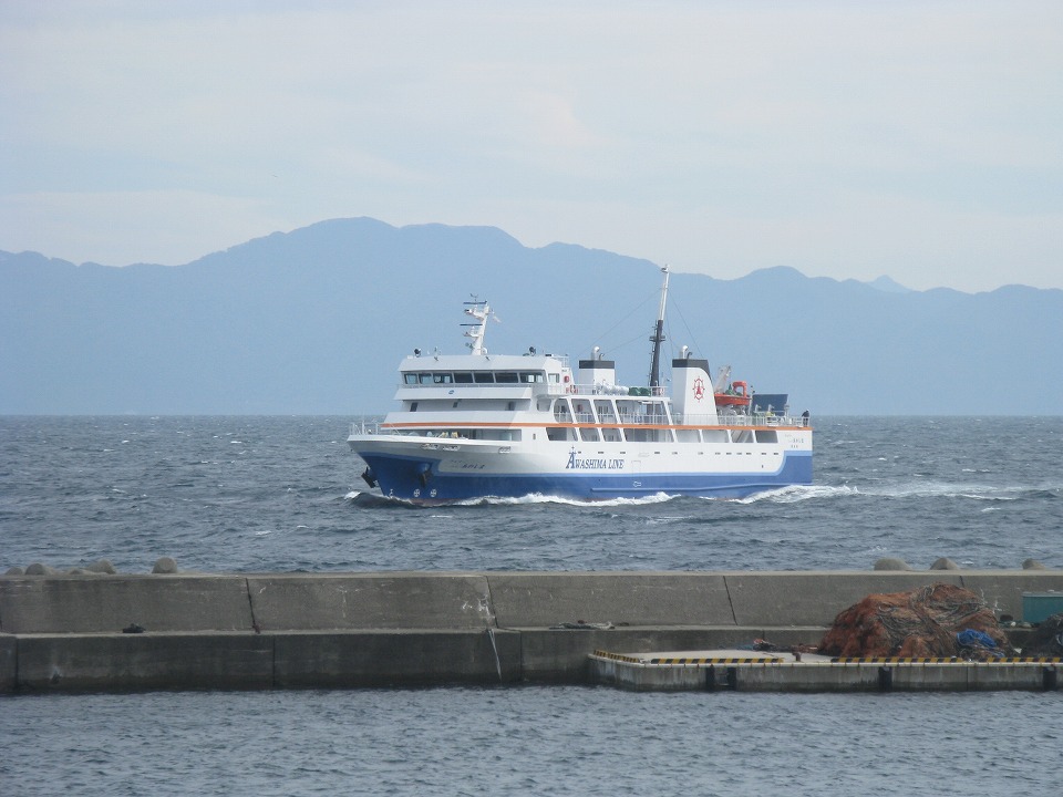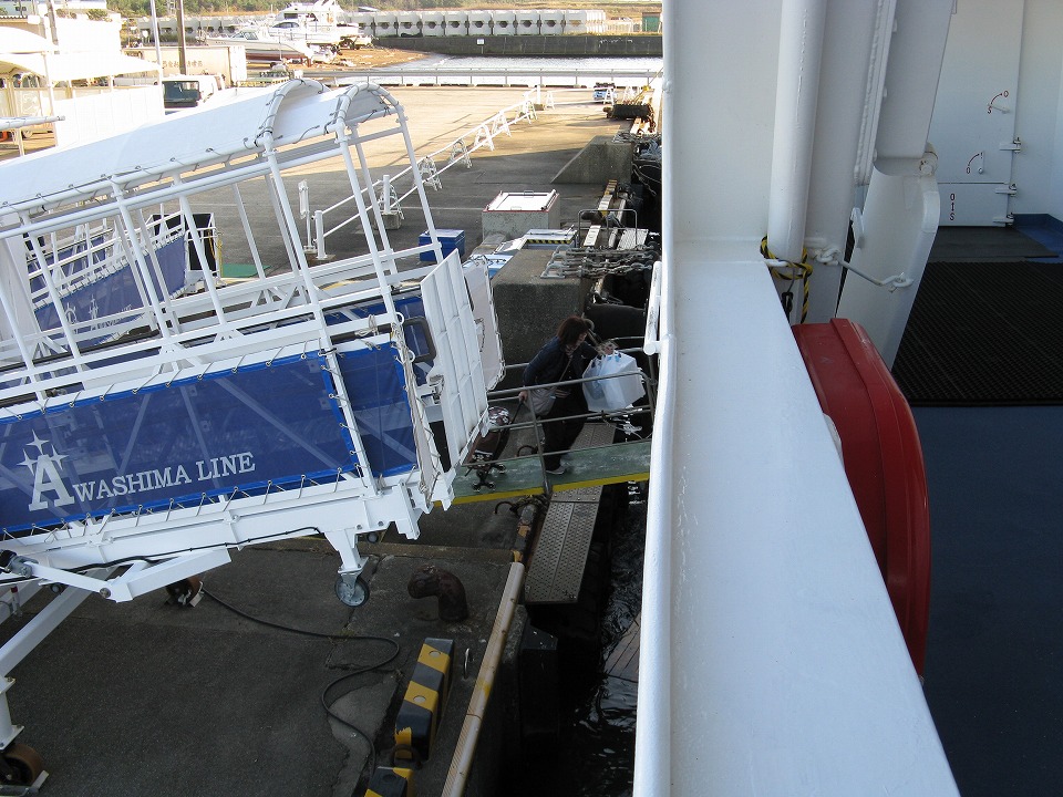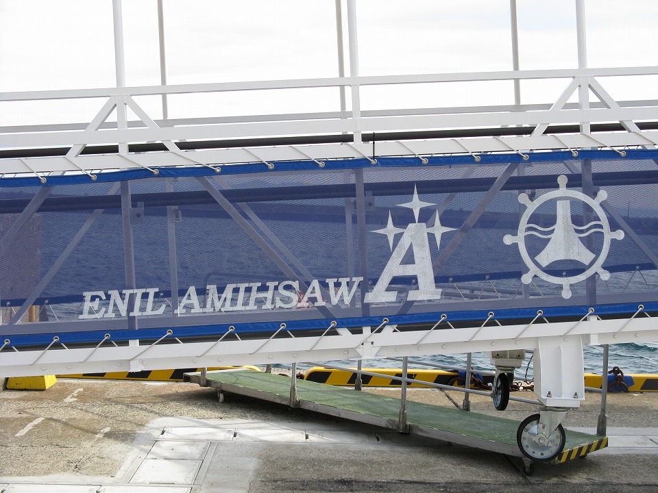 | 乗客が船に乗り降りする可動式のデッキ。 このアルファベットはどう読むのかと思ったよ。 「エニール・アミーソーA」か。 …んでなくて、これは右から「アワシマ ライン」なんだな~。 アルファベットの右書きってぇのは、なかなか見ないゾ。 |