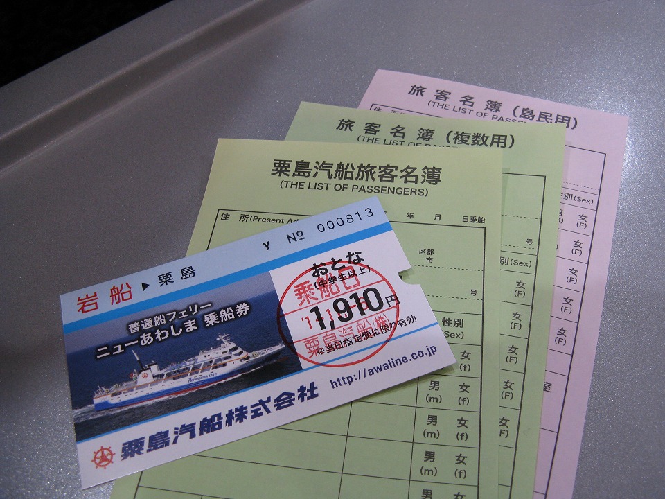 | フェリーは予約不要なので、旅客名簿を書いてチケットを買う。 支払いはSuicaも使えるよ。 バックの乗船名簿各種は、収集用(笑)。 |